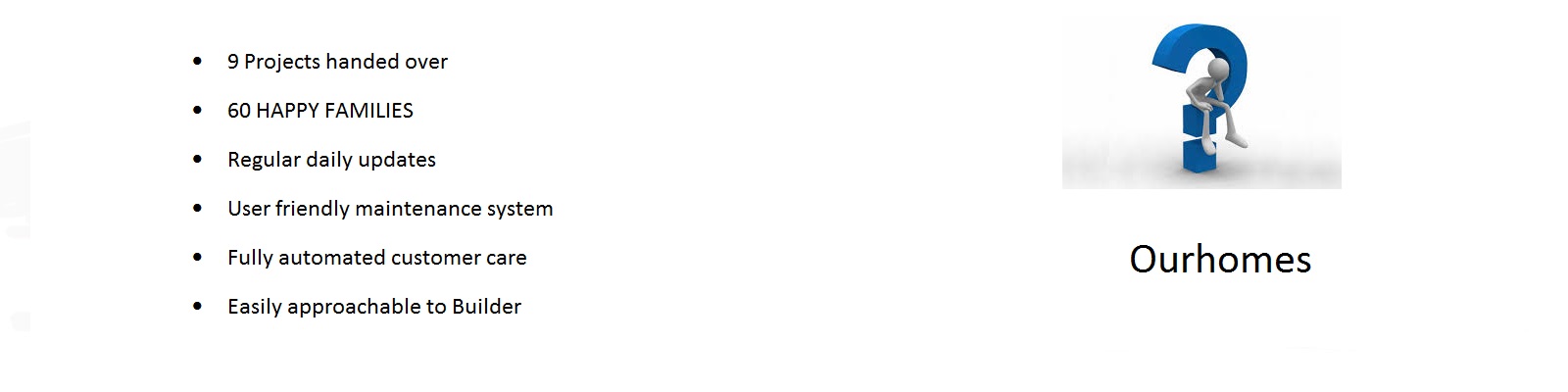 Ourhomes is one of the emerging builders with a team of talented professionals and highly skilled labours aimed at delivering high quality residential flats. As we know the value of your dream home, we have not only built with sand and Bricks and but also built with trust and relationship. People say, higher the quality higher will be the price; our focus is to deliver good quality homes on affordable price. We are fully customer oriented and out motto is customer satisfaction.